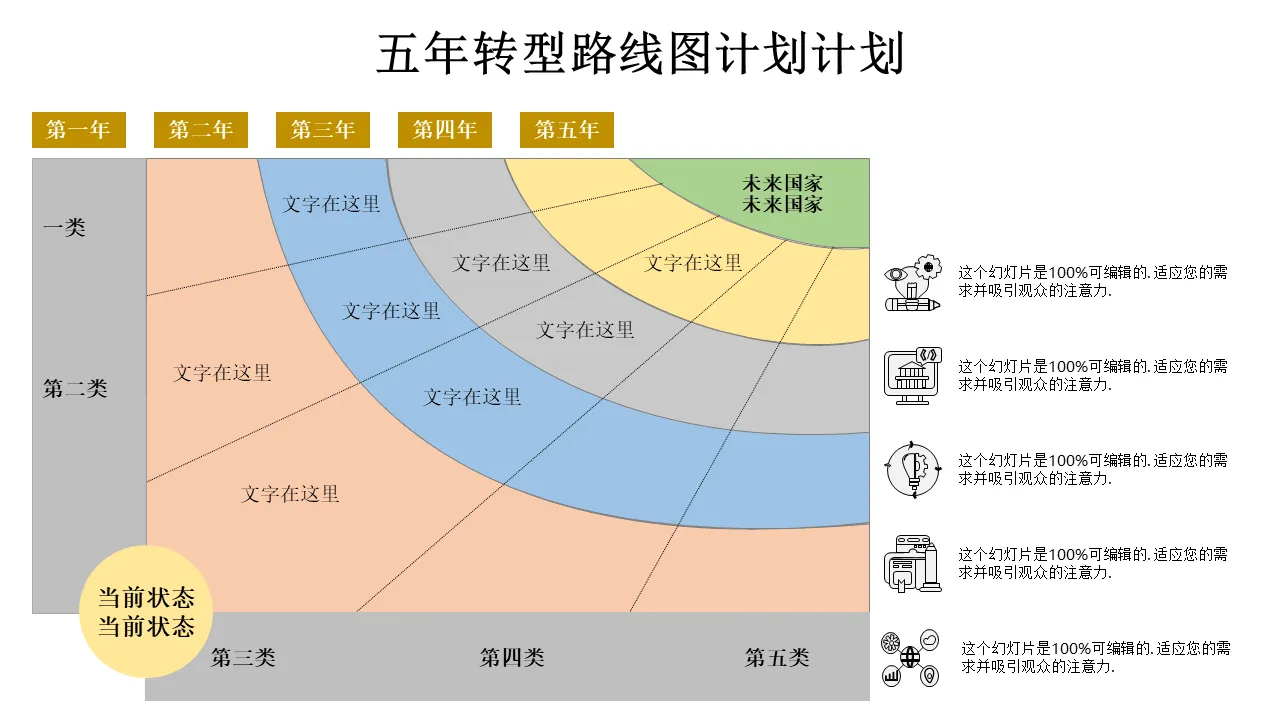 专业设计的年度转型路线图计划,用于数字化转型演示。可编辑的幻灯片采用现代设计,非常适合商务专业人士、顾问和团队。干净的布局可供定制。