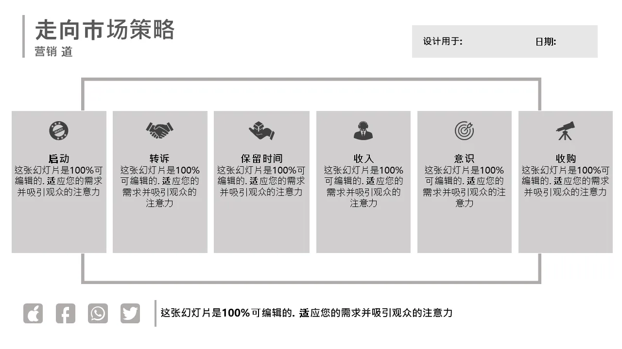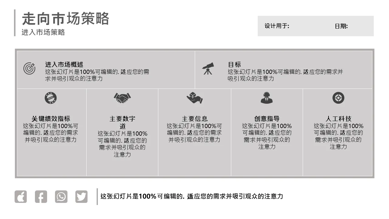 此模板提供了一个可视化框架,用于开发和呈现全面的进入市场策略。它帮助团队以清晰、结构化的方式映射客户需求、定位、渠道和收入模式。它将复杂的规划简化为可操作的视觉指南,非常适合产品发布、投资者推介和内部战略会议。