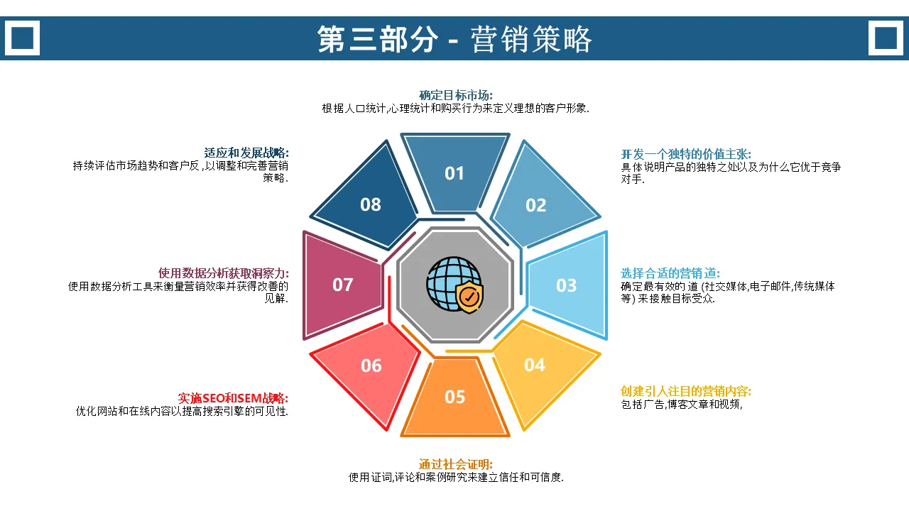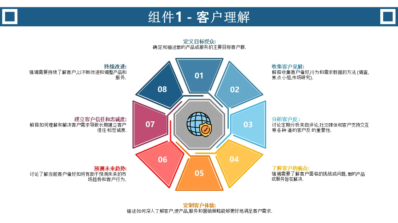 - 八个不同的、可自定义的部分,代表客户获取、产品创新和保留等关键业务组成部分。