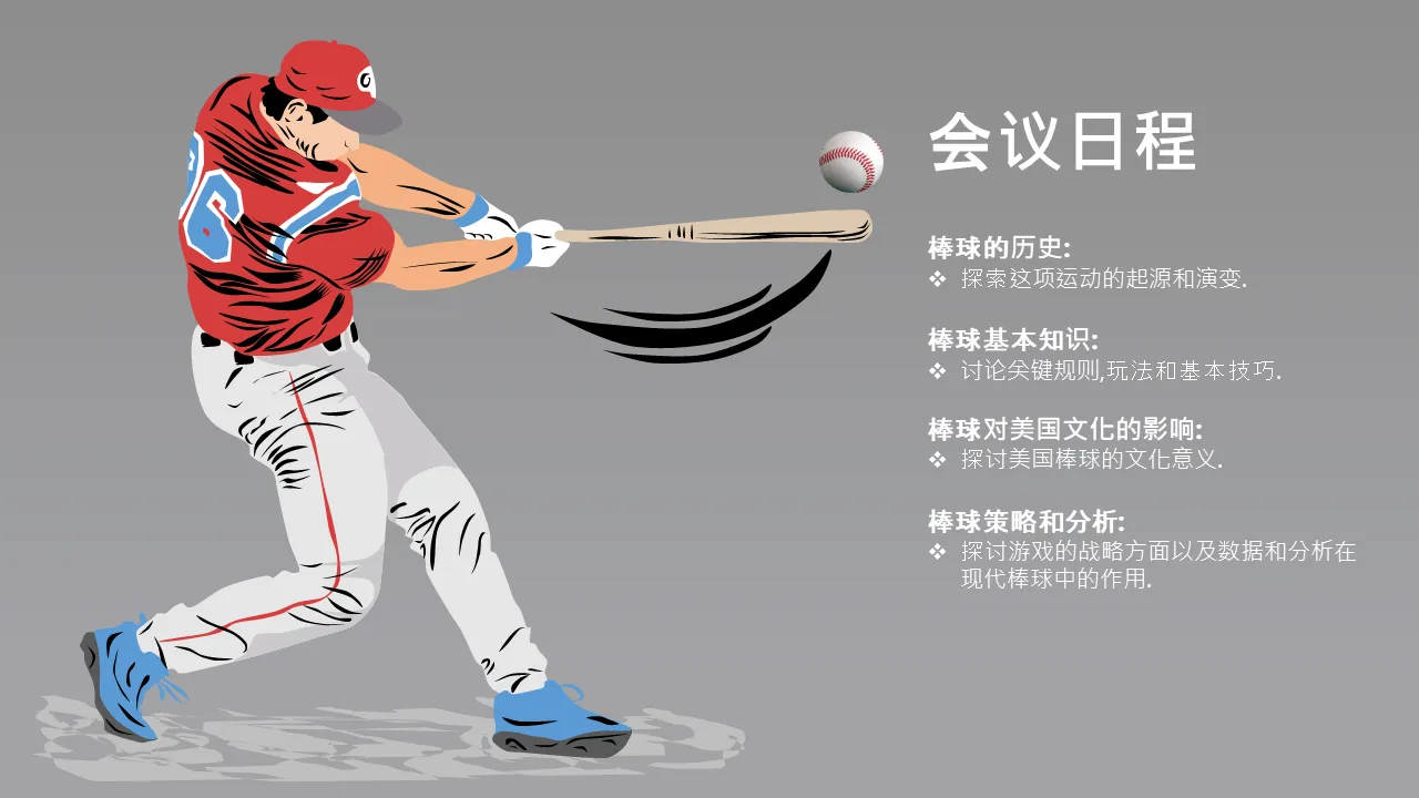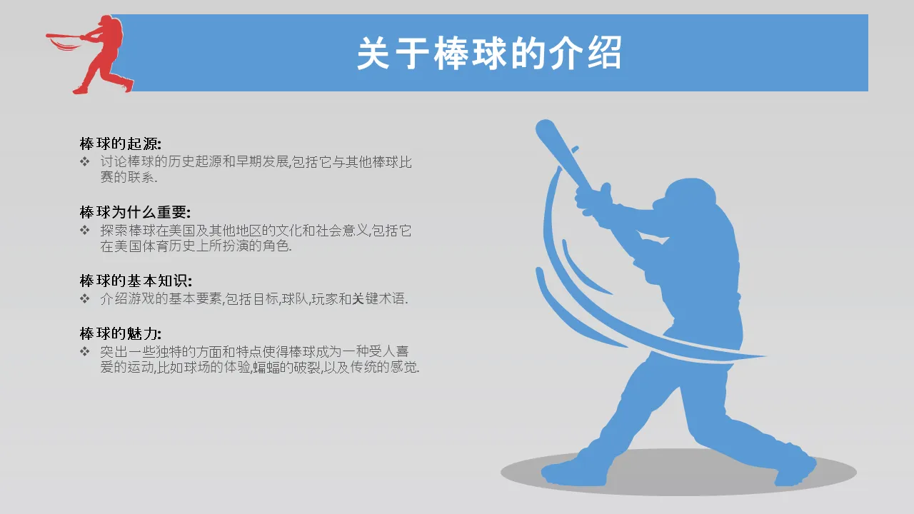 学校、博物馆、体育俱乐部和社区中心的演示者可以使用此模板来教授或讨论棒球的演变、文化意义和游戏规则。它适合教育工作者、体育记者和业余历史学家,他们需要一个精美的视觉工具来解释棒球的全球影响力和美国根源。它还适用于球迷团体组织有关棒球传统和里程碑的活动或回顾。