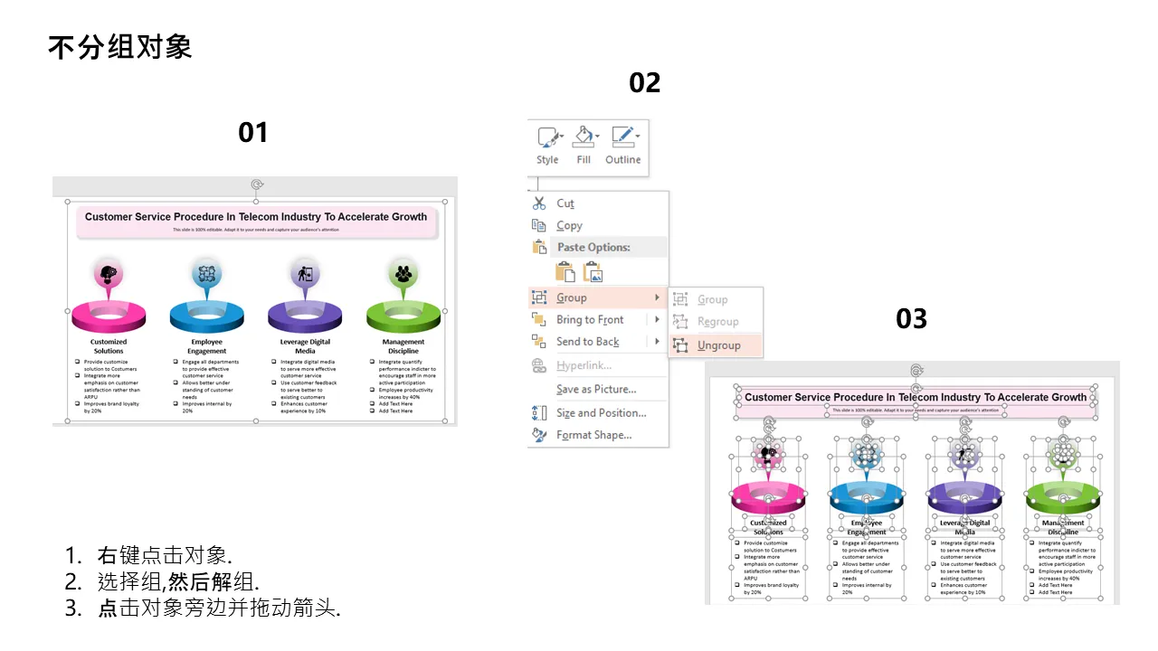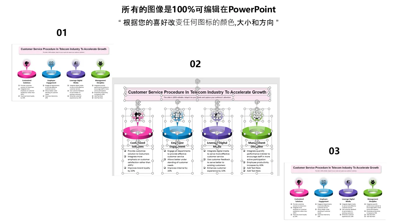 此专业 PowerPoint 模板旨在帮助电信公司概述和呈现清晰的客户服务流程,通过提高满意度和运营效率来推动增长。它强调以客户为中心的策略,而不是 ARPU 等传统指标,使其成为寻求重新调整优先事项的领导团队的理想选择。该模板完全可定制且具有视觉吸引力,可帮助演示者有效地传达流程改进和员工参与计划。