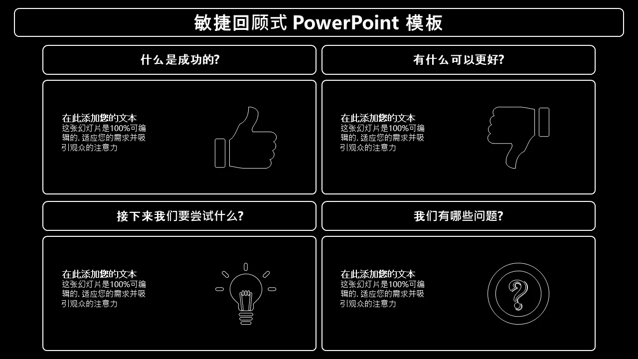此敏捷回顾 PowerPoint 模板旨在帮助团队反思最近的冲刺、确定改进领域并规划可行的后续步骤。它支持使用鼓励协作和清晰度的视觉元素进行结构化讨论。该模板非常适合 Scrum Master、产品负责人和敏捷教练,通过提供即用型图表和可编辑布局来简化回顾会议。