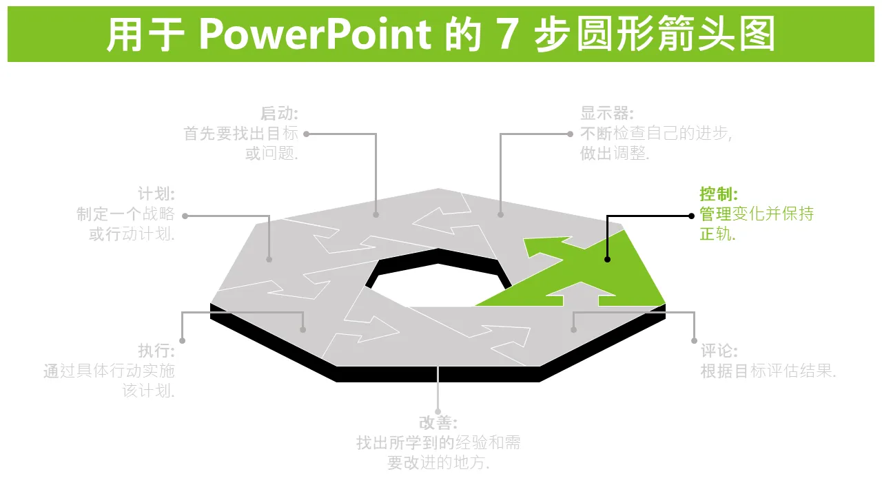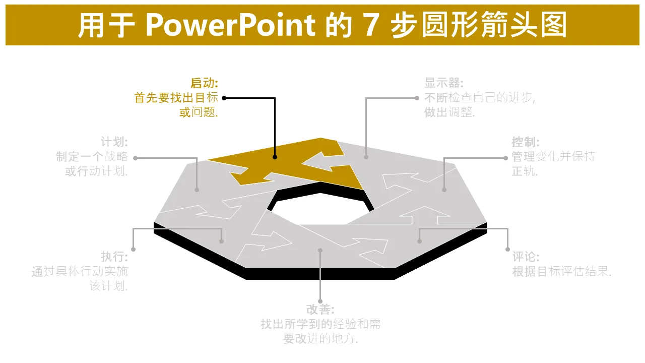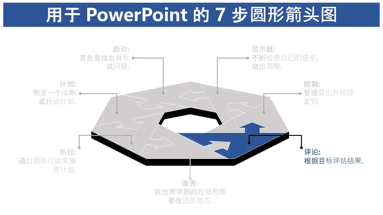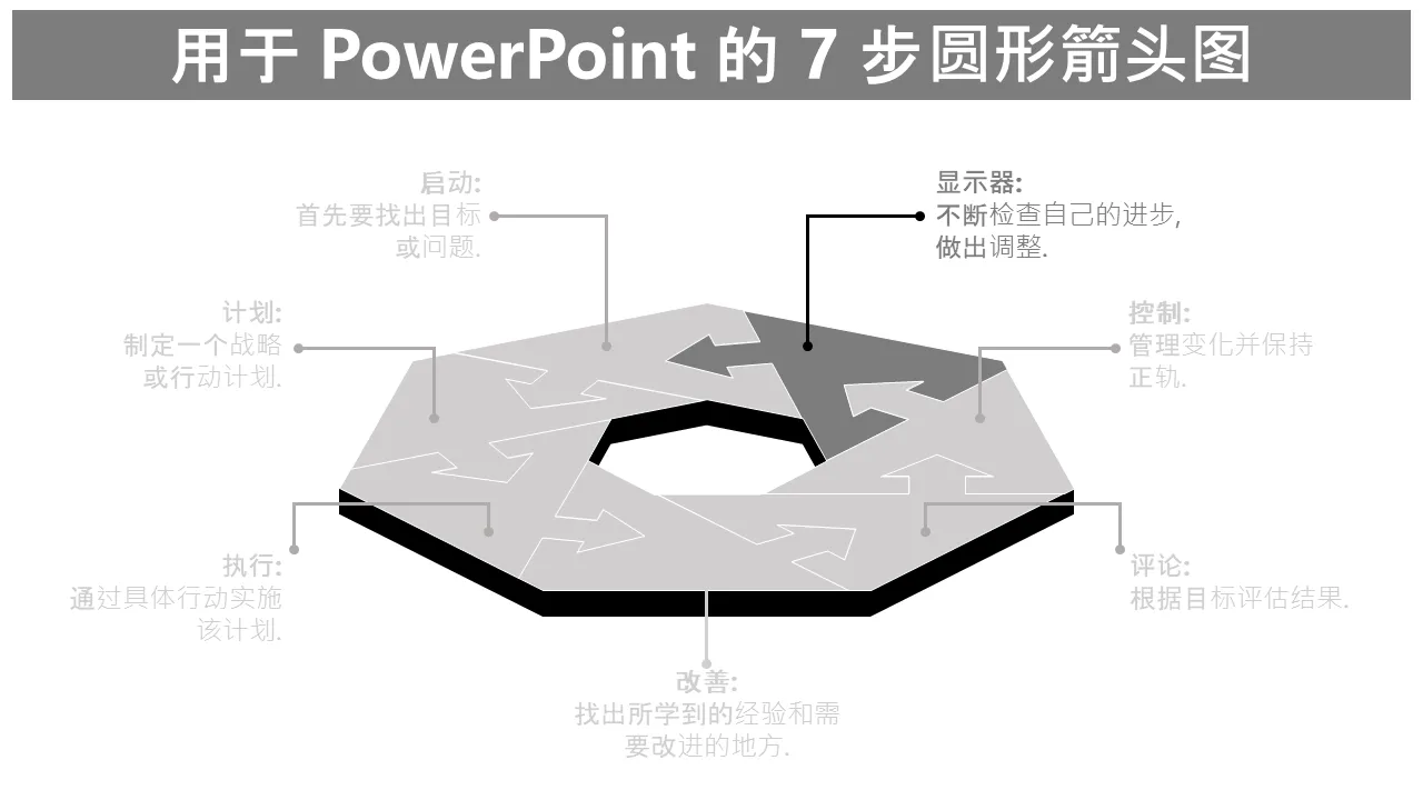 - 七个不同的圆形箭头段,用于逐步流程可视化