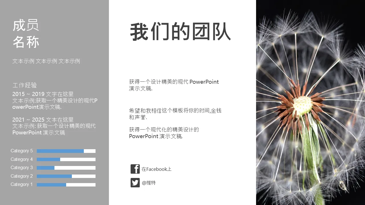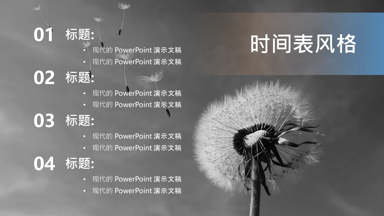 这个优雅的 PowerPoint 模板使用蒲公英种子在风中飘扬的比喻来象征增长、传播和战略扩张。它非常适合商业战略演示,它直观地展示了想法、市场和机会如何跨地区或客户群有机传播。该设计将现代美学与自然图像融为一体,创造出令人难忘、引人入胜、能引起观众共鸣的套牌。