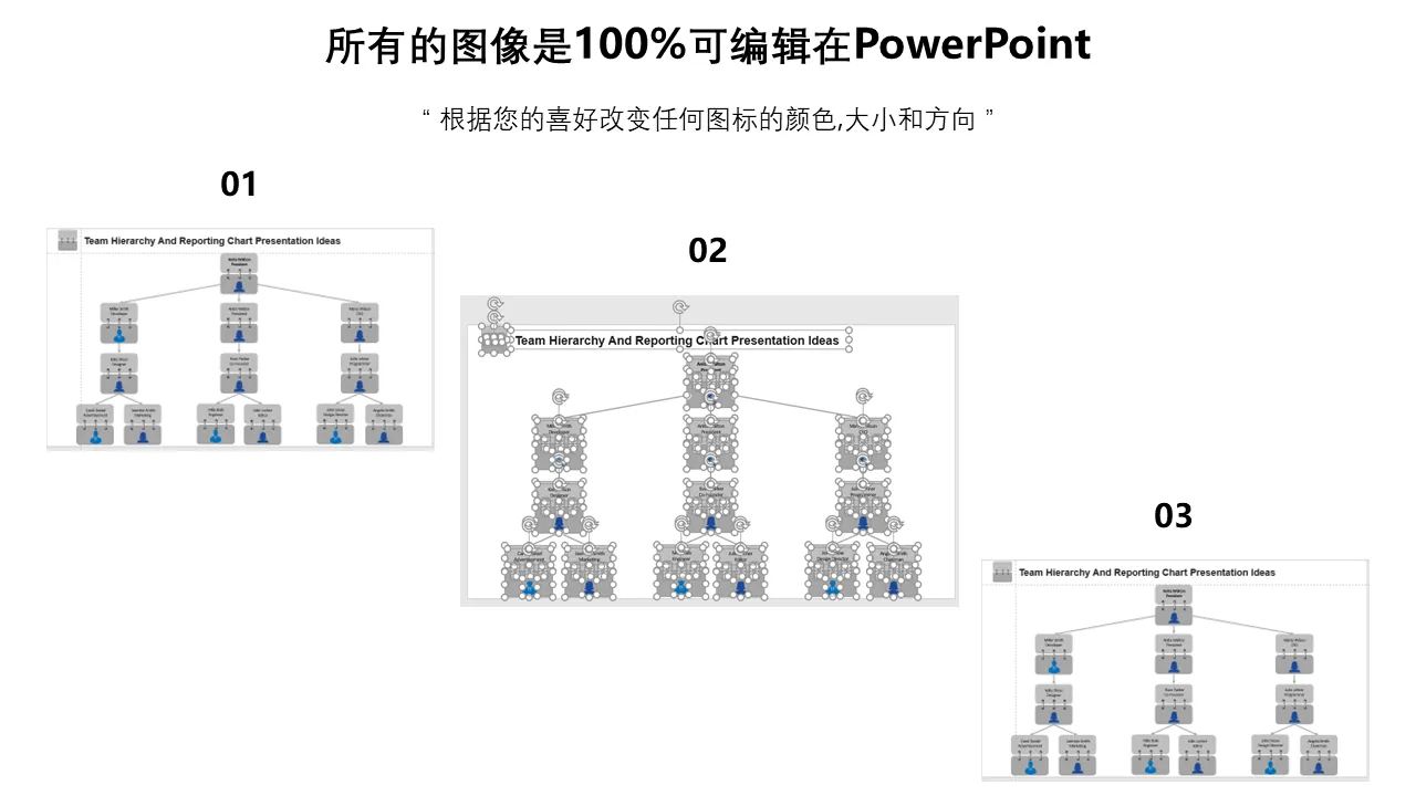 团队层次结构和报告图表演示想法专业演示的 PowerPoint 模板的特点