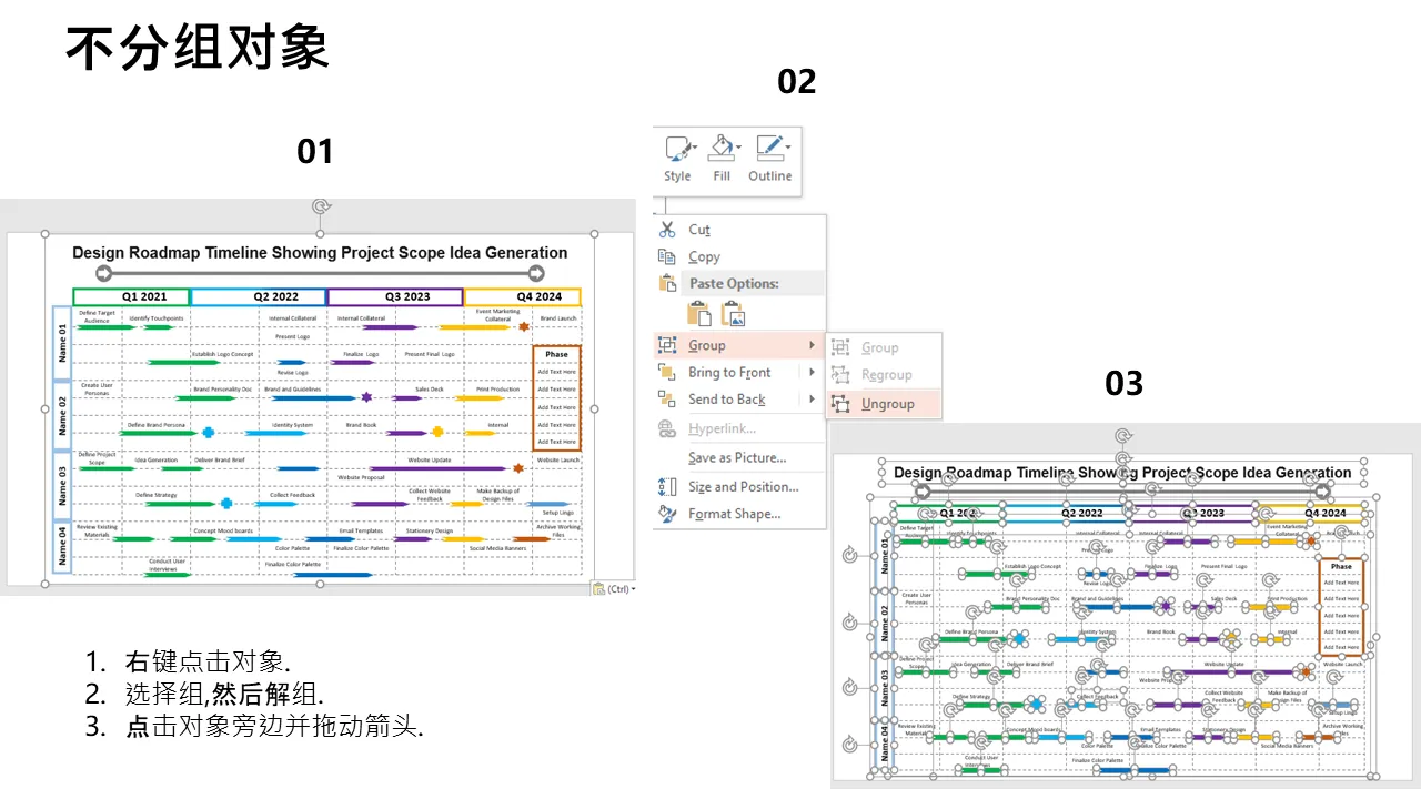 - 预先设计的时间线布局,具有用于创意生成和范围定义的可扩展阶段