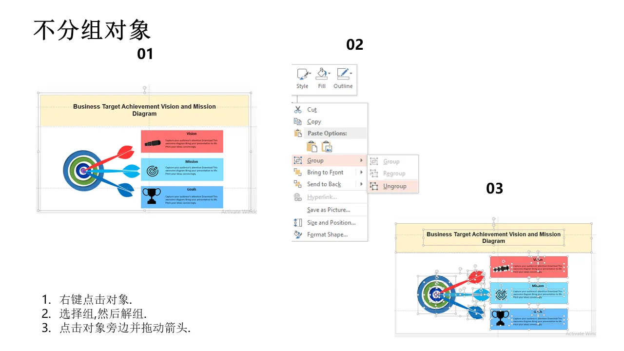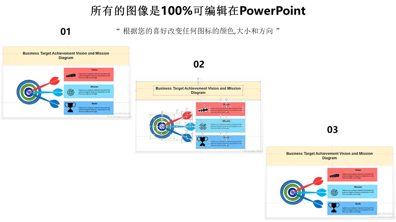 业务目标实现愿景和使命图 Powerpoint 模板的特点